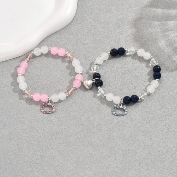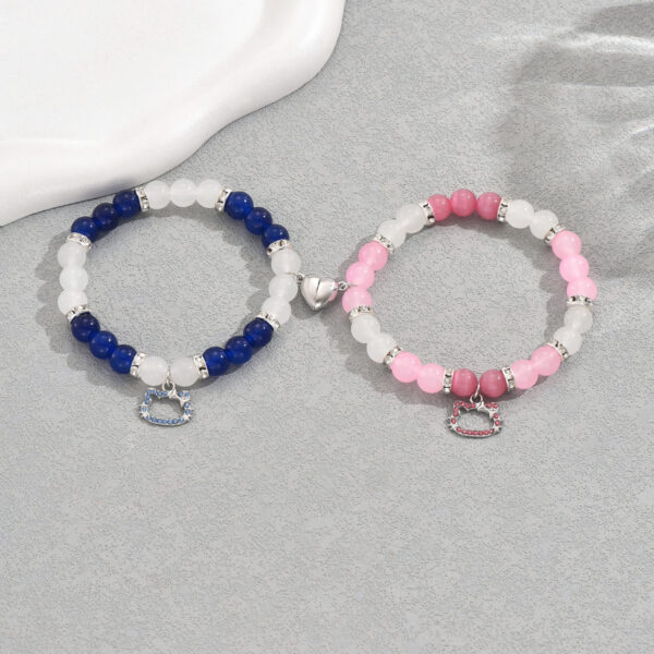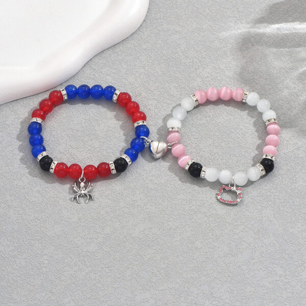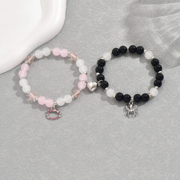 Discover a set of bracelets designed to symbolize connection and style. Crafted with glass beads and metallic charms featuring sparkling rhinestone inlays. While appearing metallic, these pieces are made from non-precious materials, ensuring a stylish look built for longevity. The set features round glass beads in vibrant color combinations, accented by unique charms including a spider, a magnetic heart, and a charming cartoon cat silhouette adorned with rhinestones. The design draws inspiration from popular European and American fashion trends. Perfect for everyday wear or adding a fashionable touch to your look. Wear them individually or as a matching set to celebrate friendship or connection. More than just accessories, these bracelets serve as a tangible reminder of special bonds.