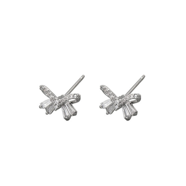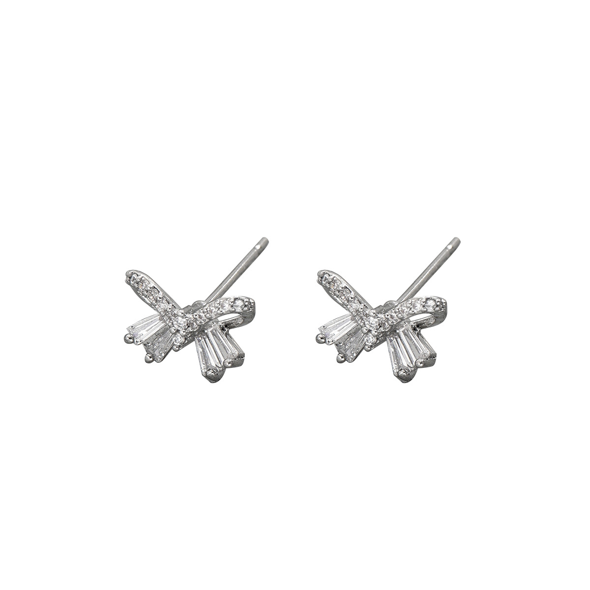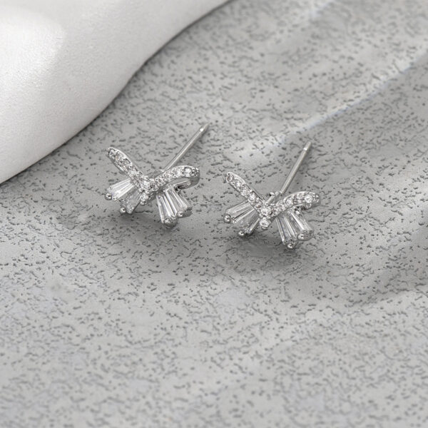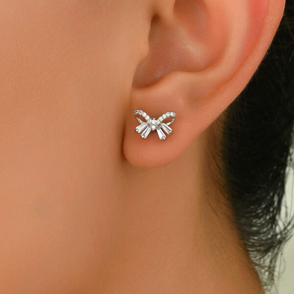 The design showcases a delicate bow shape, adorned with brilliant baguette-cut stones forming the loops and a round stone at the center, creating a look that is both sweet and sophisticated.