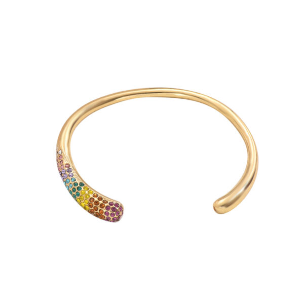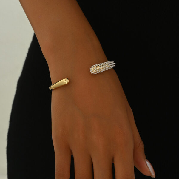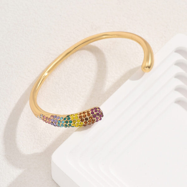 Crafted from durable copper, this bracelet features meticulously inlaid stones, showcasing careful attention to detail and quality. The open cuff design offers a modern aesthetic, adorned with a cluster of dazzling inlaid stones. Available in vibrant colorful or classic clear stone options, the geometric arrangement adds a sophisticated touch. Its light luxury style makes it perfect for fashion commuting and versatile enough to elevate both casual and more formal outfits. Wear this bracelet to add a touch of refined sparkle and confidence to your look.