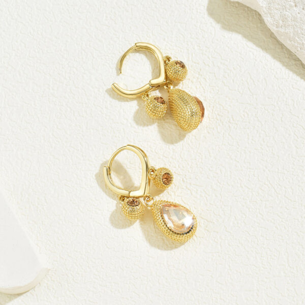 Elevate your everyday look with these elegant copper earrings, designed to seamlessly transition from your commute to your evening plans. Crafted from durable copper, these earrings feature expertly inlaid stones that catch the light beautifully. While not precious metals or gems, the careful craftsmanship ensures a refined appearance and lasting wear. The design combines geometric elements with a classic water drop shape, creating a modern yet timeless appeal. The warm gold tone complements the radiant champagne-colored stones, adding a touch of subtle glamour. Perfect for adding a sophisticated touch to your business attire or dressing up a casual outfit, these earrings are versatile enough for various occasions. Wear them to feel polished and confident throughout your day.