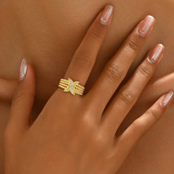 - Design Features: Open band, Bead band, Geometric stone design, Stone accents, Gold-tone finish