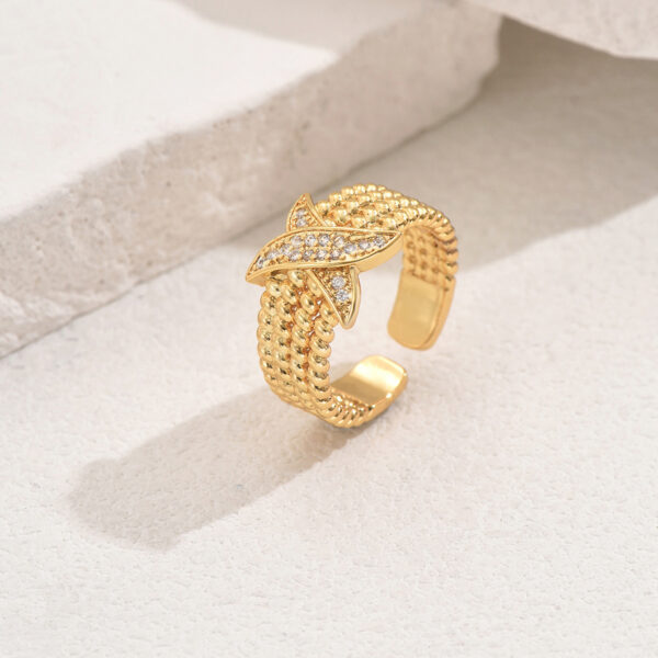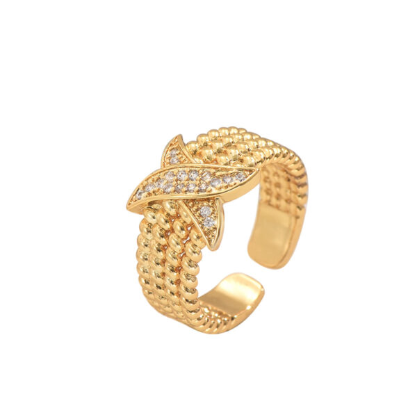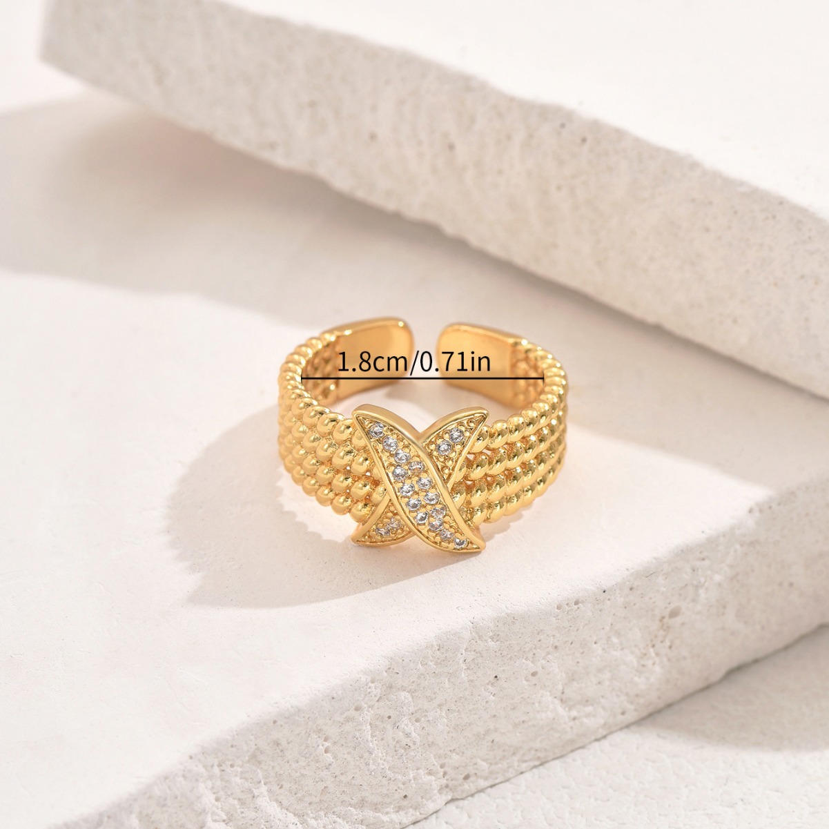 Discover effortless style with our Copper Open Ring, designed for versatile wearability across various settings. Crafted from copper with precision stone setting, this ring is designed for lasting appeal. Featuring a stylish bead band and a central geometric design adorned with sparkling stones, its open structure ensures a comfortable fit. The gold-tone finish adds a touch of elegance. Perfect for adding a touch of light luxury to your everyday look or complementing your office attire, this ring transitions seamlessly from casual outings to more polished occasions. Wear it to enhance your confidence and express your personal style.