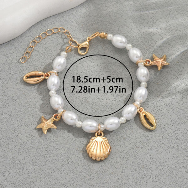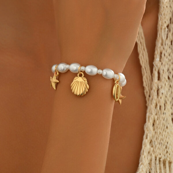 Capture the essence of the seaside with this charming bracelet, inspired by the beauty of the ocean. Crafted with care, this bracelet features lustrous faux pearls and durable zinc alloy charms, designed for lasting wear. The design showcases elegant oval faux pearls interspersed with delightful gold-colored charms, including a starfish and various shells, evoking a serene beach aesthetic. Perfect for adding a touch of coastal charm to your everyday look, this bracelet is ideal for casual outings, vacations, or as a lovely travel souvenir. Wear it as a reminder of sunny days and ocean breezes, adding a unique and personal touch to your style.