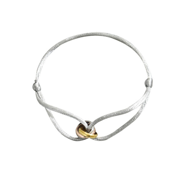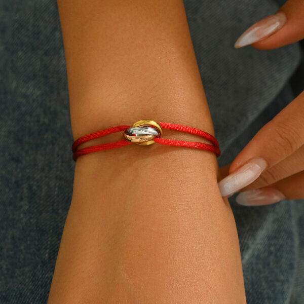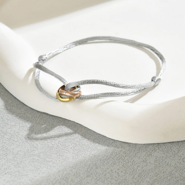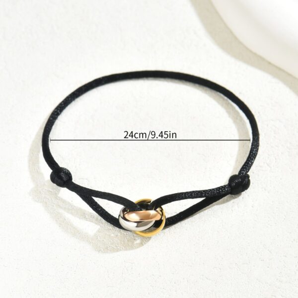 The design features three interlocking geometric rings, creating a subtle yet eye-catching detail. The string design is simple and the bracelet is adjustable for a comfortable fit. Perfect for everyday wear, this bracelet adds a touch of modern simplicity to casual outfits and is suitable for various daily settings. Embrace understated elegance and personal style with this versatile accessory.