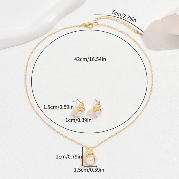 Dive into the beauty of the ocean with this stunning jewelry set, inspired by the elegant form of the conch shell. Crafted from durable alloy, this set features beautifully inlaid pearls, showcasing careful attention to detail in its creation. The design centers around a charming conch shell motif, complemented by a lustrous pearl. The necklace hangs from a classic regular chain, while the matching earrings echo the same delightful design. This set captures a chic European and American style with a touch of marine charm, perfect for adding a unique touch to your daily outfits or elevating your look for casual outings and fashion-forward commuting. Wear this set to express your love for the sea and add a distinctive, elegant flair to your personal style.