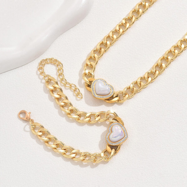 Elevate your everyday style with this chic gold-tone jewelry set, designed to add a touch of trendy charm to any look. Crafted from durable alloy, this set features carefully inlaid rhinestones surrounding a lustrous heart pendant, showcasing attention to detail and quality craftsmanship. The trendy cuban link chain provides a modern base for the classic heart-shaped pendant, which features an iridescent white inlay, offering a blend of contemporary and timeless design elements. Perfect for adding a fashionable accent to casual outfits or complementing a more dressed-up look for day or evening. Wear this set to express your personal style and feel confident and put-together.