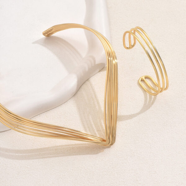Elevate your look instantly with this stunning multi-layer necklace and bracelet set, designed to transform any outfit and occasion. Crafted from durable alloy with a brilliant gold tone electroplated finish, this set offers lasting style and shine. The necklace features multiple sleek strands converging into a striking V-shape, creating a modern, geometric silhouette. The coordinating bracelet mirrors this multi-layer design for a cohesive look. Perfect for the fashion-forward commuter, this set seamlessly transitions from professional settings to casual outings or even adds a touch of modern elegance to evening attire. Wear this set to make a confident statement and showcase your modern style.