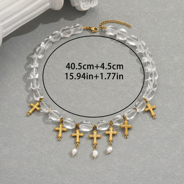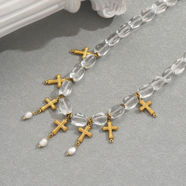 The design features clear, faceted beads strung together, adorned with delicate gold tone cross pendants and lustrous pearl drops. Its European-inspired style offers a blend of classic motifs and modern fashion.
