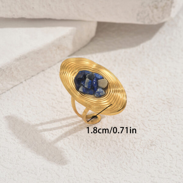 Crafted from copper with a lustrous gold tone finish, this ring features carefully inlaid blue crystals that add a touch of vibrant color. The bold oval shape and geometric design create a modern aesthetic, while the open band ensures a comfortable, adjustable fit.