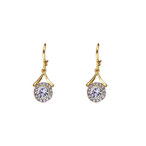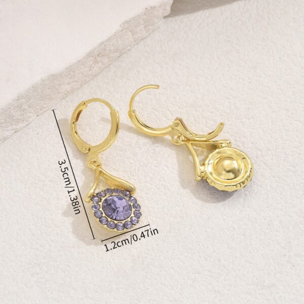 Experience the fresh and sweet aesthetic of our latest collection, crafted with meticulous attention to detail and designed for versatile wear. These elegant earrings are crafted from durable copper with a gold-tone finish, featuring meticulously inlaid stones that capture the light with every movement. The design showcases a captivating purple central stone, encircled by sparkling smaller stones, set within a unique geometric frame suspended from a classic lever-back hook. This blend of round and geometric shapes creates a modern yet timeless appeal. Perfect for adding a touch of fresh sweetness to your everyday look or complementing an outfit for a special occasion. Their versatile design makes them suitable for casual outings or dressier events. Let these earrings enhance your natural charm and express your unique style.