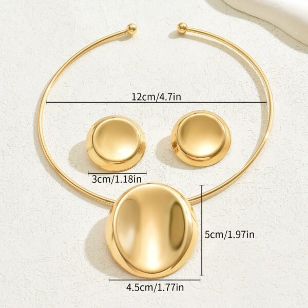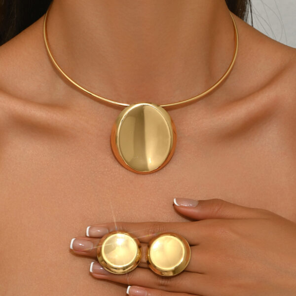 The set features a striking collar necklace with a large, smooth oval pendant and matching circular stud earrings. Their clean, bold geometric forms embody a contemporary aesthetic that makes a confident statement.
