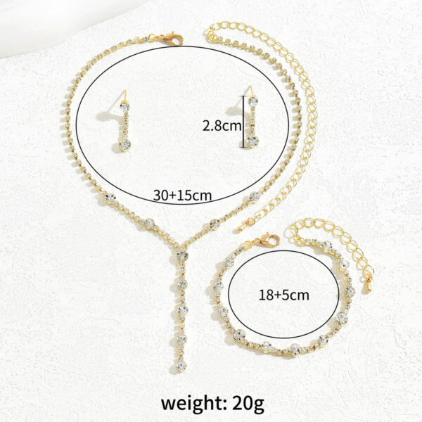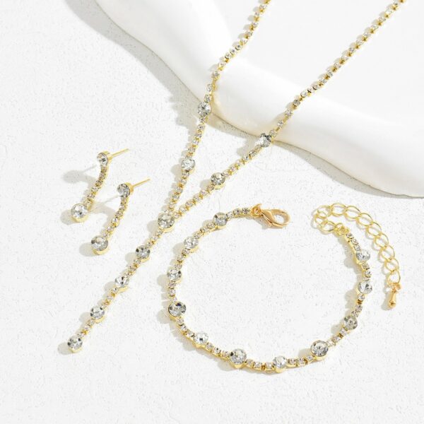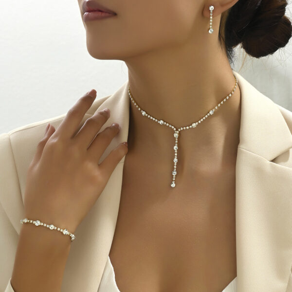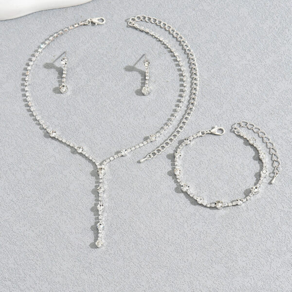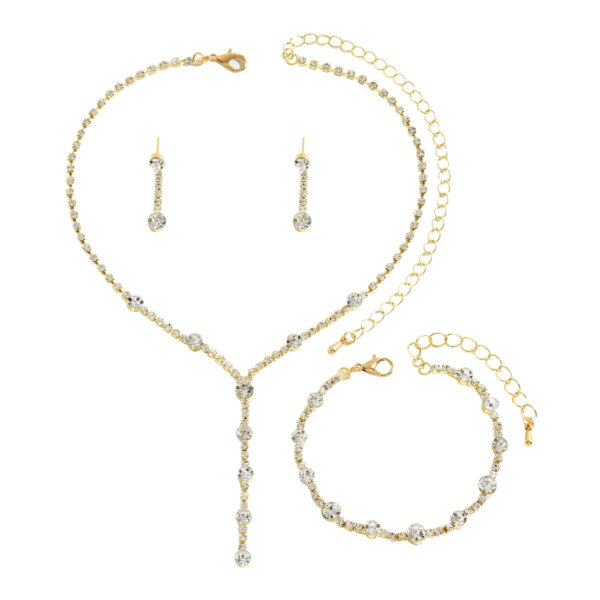 The design features a modern geometric pattern with linear arrangements of stones, including a striking Y-drop necklace, complementary dangle earrings, and a delicate bracelet, creating a cohesive and elegant aesthetic.