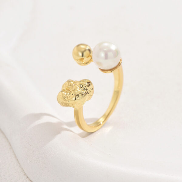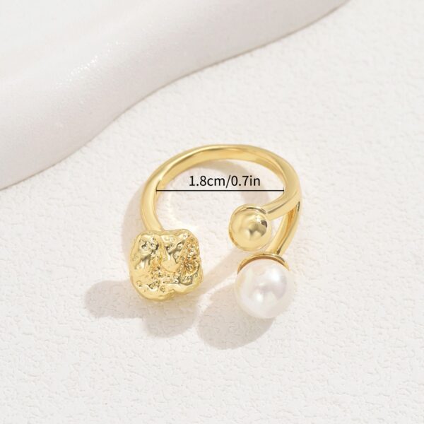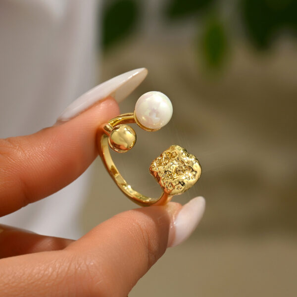 Enhance your everyday style with this versatile open ring, perfect for seamlessly transitioning from work to casual outings. Crafted from durable copper, this ring features a radiant gold-tone finish that captures the light beautifully. The unique open design showcases a lustrous pearl paired with a smooth geometric sphere on one end, balanced by a striking textured nugget on the other, creating a modern and artistic asymmetry. Ideal for daily wear or adding a sophisticated touch to your office attire, this ring is a simple yet impactful accessory, allowing you to make a subtle statement of contemporary elegance.